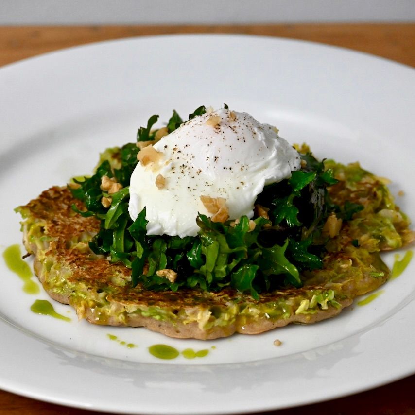 Buckwheat flour is a nutty grain with distinctive flavour that pairs with brassicas beautifully. Red Russian and hungry gap kales are tender enough to enjoy raw, lightly dressed in a vinaigrette and bring a delicious texture to the pancake. Topped off with a runny egg and that’s brunch.